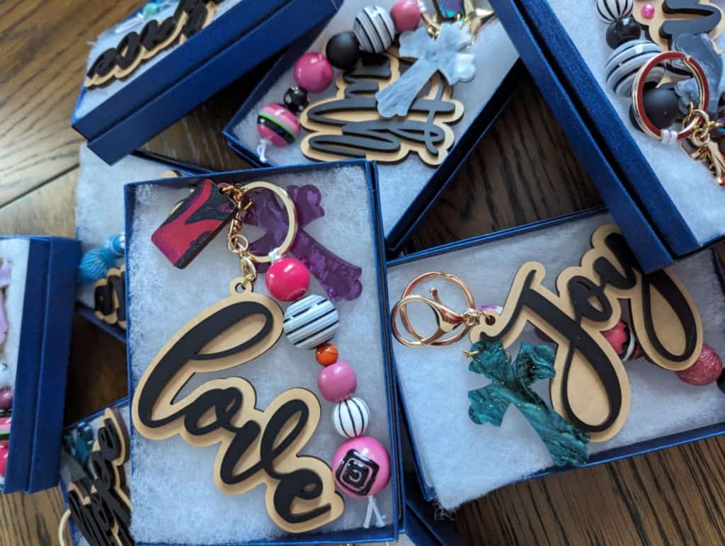 Our desire to create these tangible affirmations led to the creation of Link-A-Charms. Our first product, the bag tag, featured positive words like peace, joy, hope, and faith, combined with beads, an acrylic cross, and clasp hardware, offering both visual and tactile reminders of our spiritual identity.