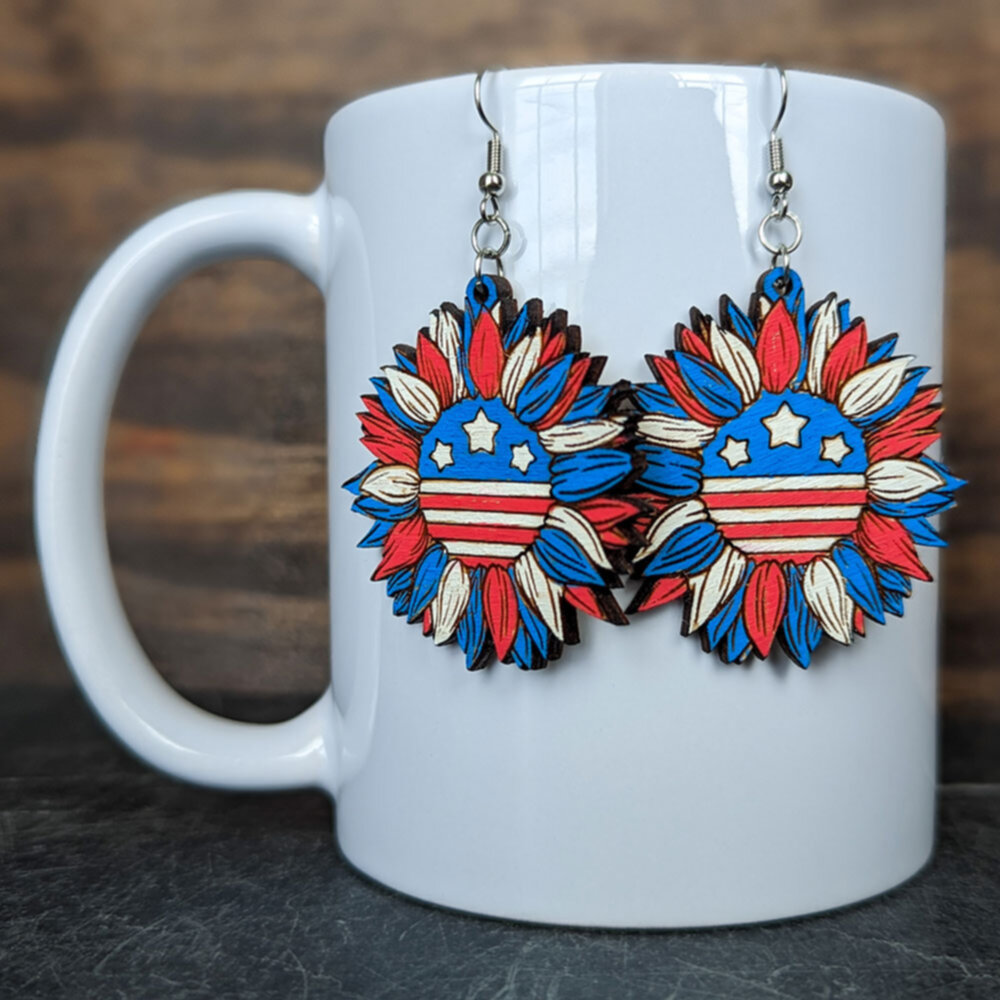 Introducing our Patriotic Earring Design Bundle, a collection that celebrates your love for your country in style. This exquisite bundle features three stunning SVG vector design files, each perfect for creating your very own patriotic earrings. Crafted with meticulous attention to detail, these designs capture the essence of American pride and showcase your patriotic spirit. The first design showcases a charming sunflower adorned with the iconic stars and stripes pattern in the center. It exudes a sense of warmth and positivity while beautifully representing the beauty of the nation. The second design is a captivating circular pattern featuring the stars and stripes, symbolizing unity and strength. With its elegant simplicity, it adds a touch of sophistication to any ensemble. Finally, the third design spells out the word “Love” in a graceful font, embellished with stars and stripes. It serves as a reminder of the enduring love and devotion we have for our country. Each design in this earring bundle is carefully crafted as an SVG vector file, ensuring seamless scalability and versatility. Whether you’re a skilled jewelry maker or an enthusiastic DIYer, these designs offer endless possibilities for expressing your patriotism. Use them to create stunning earrings for yourself or share your love for the nation by gifting them to family and friends. With our patriotic earring bundle, you have the freedom to express your love for your country with elegance and flair. Let your creativity soar as you turn these designs into wearable masterpieces that resonate with your personal style. Order your bundle today and embark on a journey of self-expression while honoring the land you hold dear. Note: As the sunflower contains some very intricate detailing, for Glowforge owners, we would recommend going no smaller than ~1.6″ with this design.