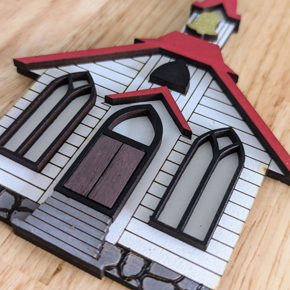 Our design file features a two-layer chapel ornament design, making it easy for you to assemble a captivating Christmas chapel ornament. The first layer serves as the background, representing the body of the chapel, while the second layer adds the intricate details that bring the ornament to life. Each element, from the charming doors and windows to the graceful roof and cross, is thoughtfully crafted to create a visually appealing and enchanting ornament.
