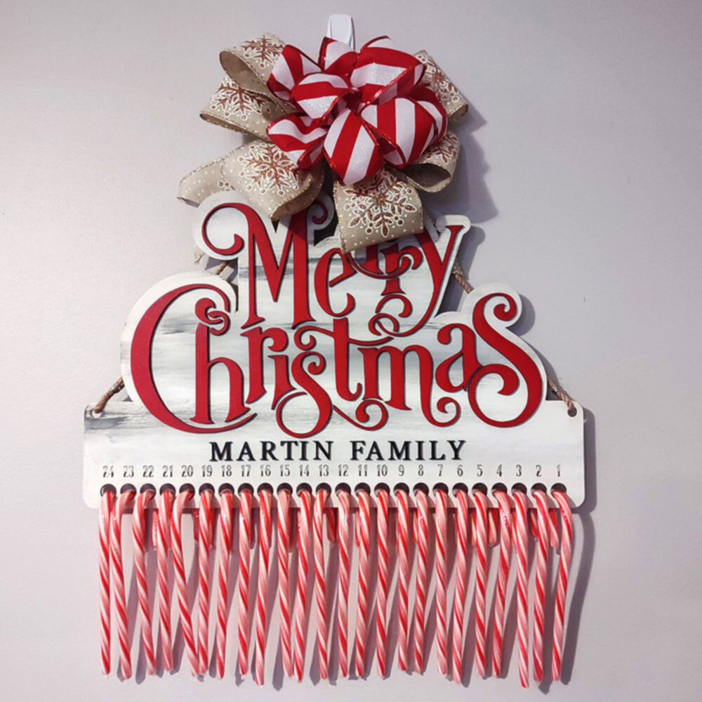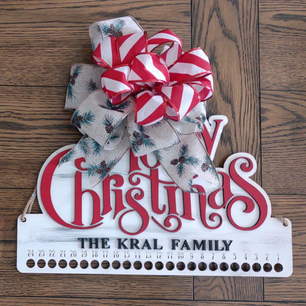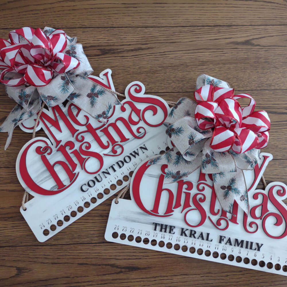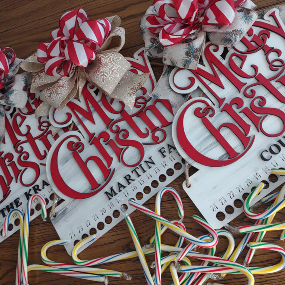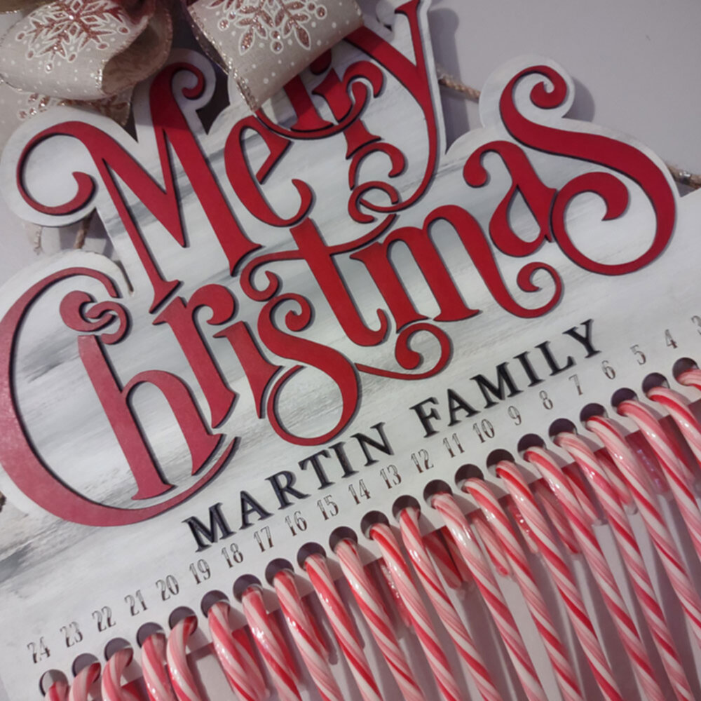 This design file encompasses a two-layer countdown setup. The background features a sturdy base holding the candy canes and the countdown etched into it. The foreground layer adds a festive touch with a beautiful cursive “Merry Christmas” and provides a space to customize the family name.