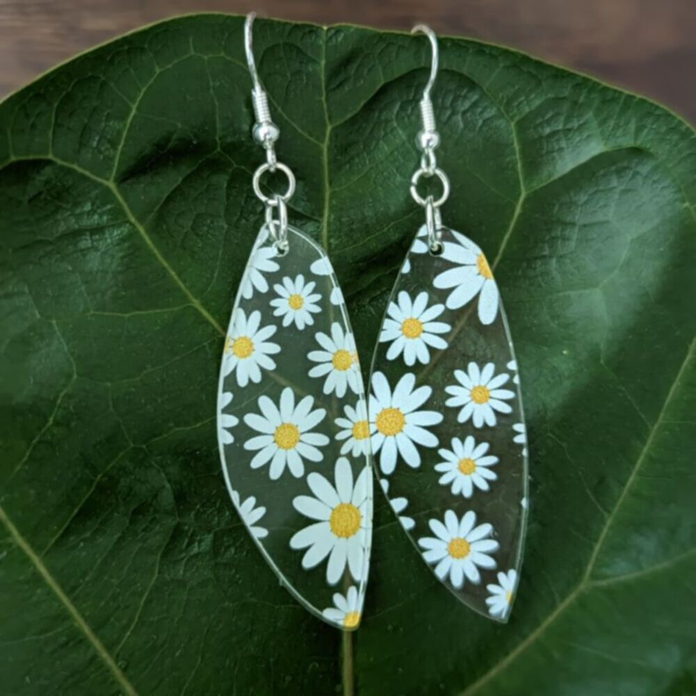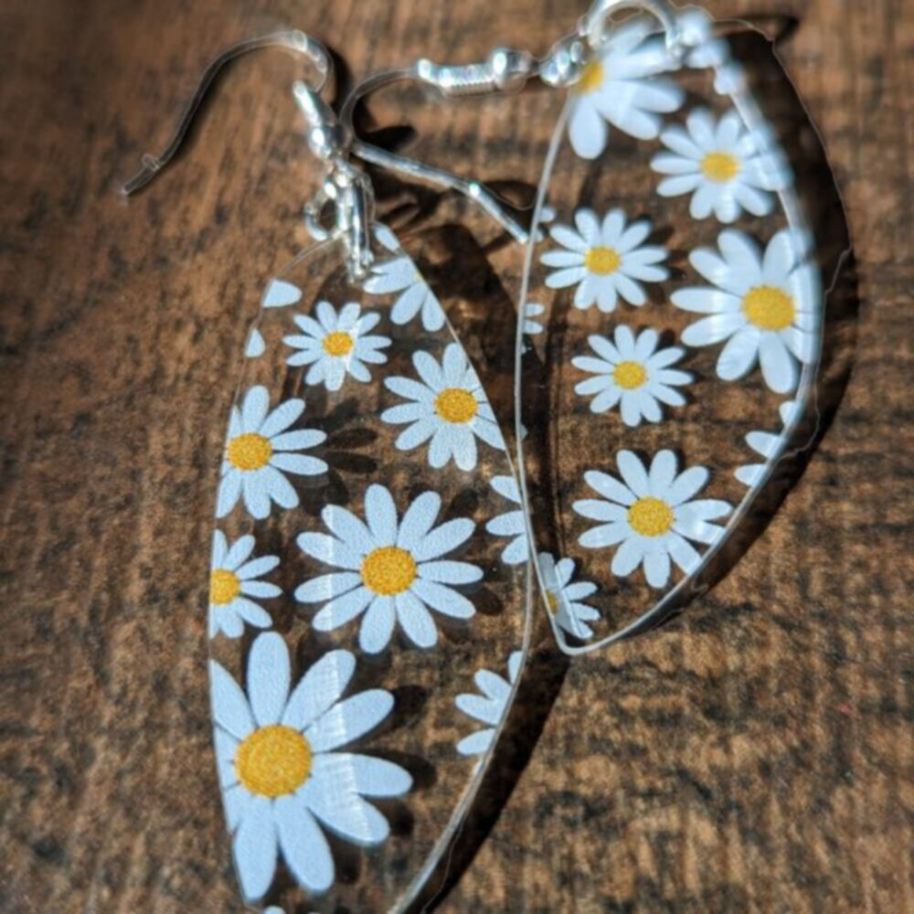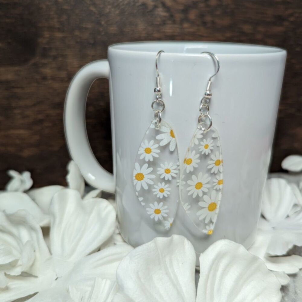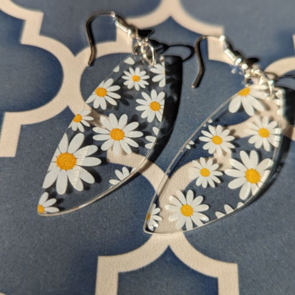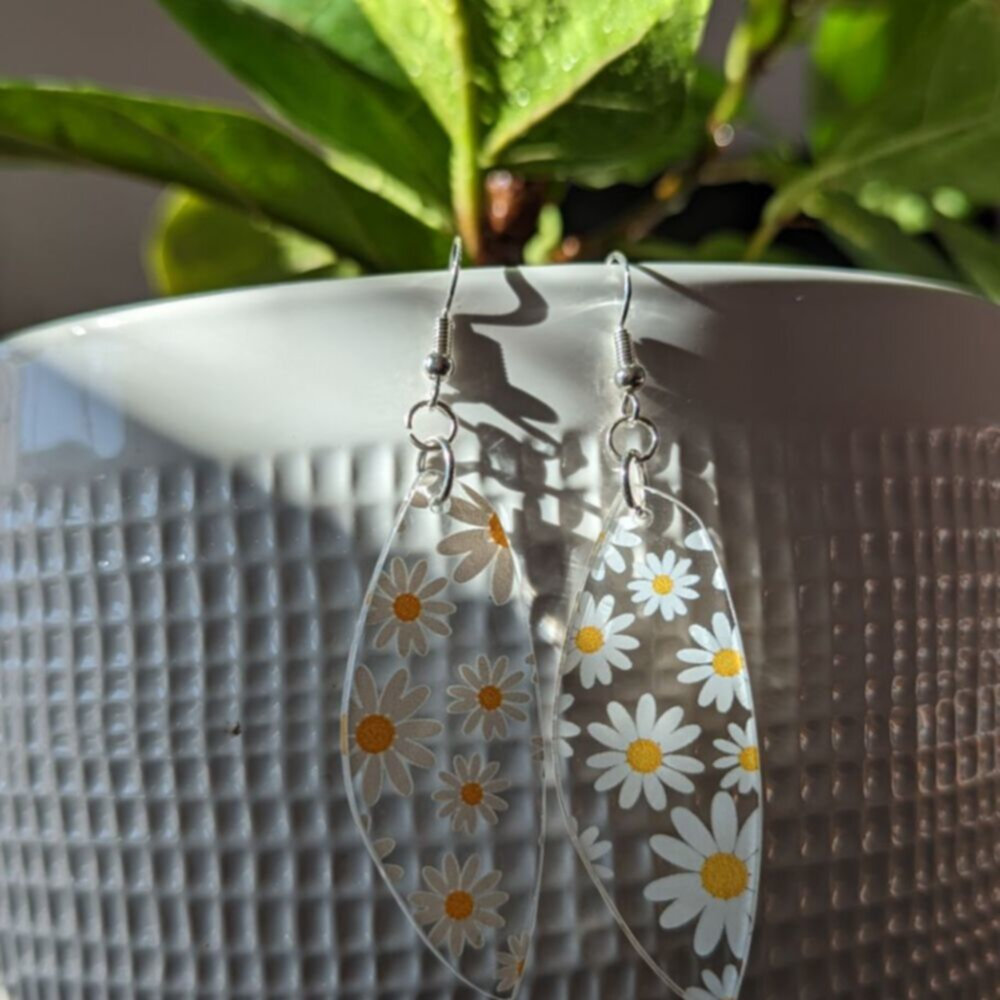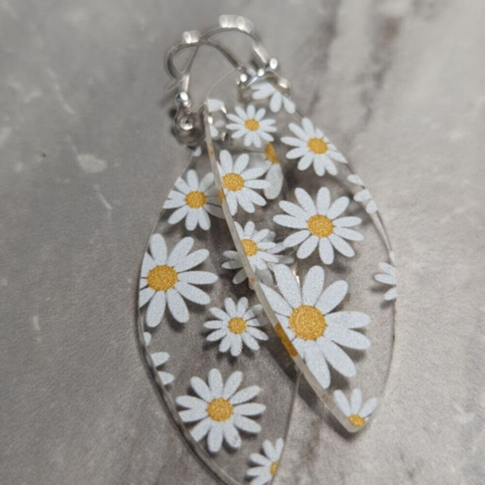 Step into warm Spring days in style with these daisy drop earrings. Perfect for adding a touch of class to any outfit, these lightweight pieces are made with nickel-free hooks and have been designed to turn heads. These delicate clear acrylic drops with printed daisies are expertly crafted and incredibly stylish, adding the perfect finishing touch to your everyday look. Whether you match them with a pretty sundress or pair them with a blouse and jeans, these drop earrings are sure to become your go-to when you want a classic and light-hearted look.