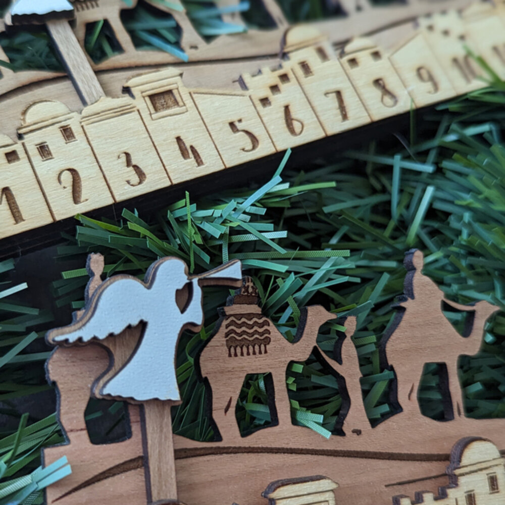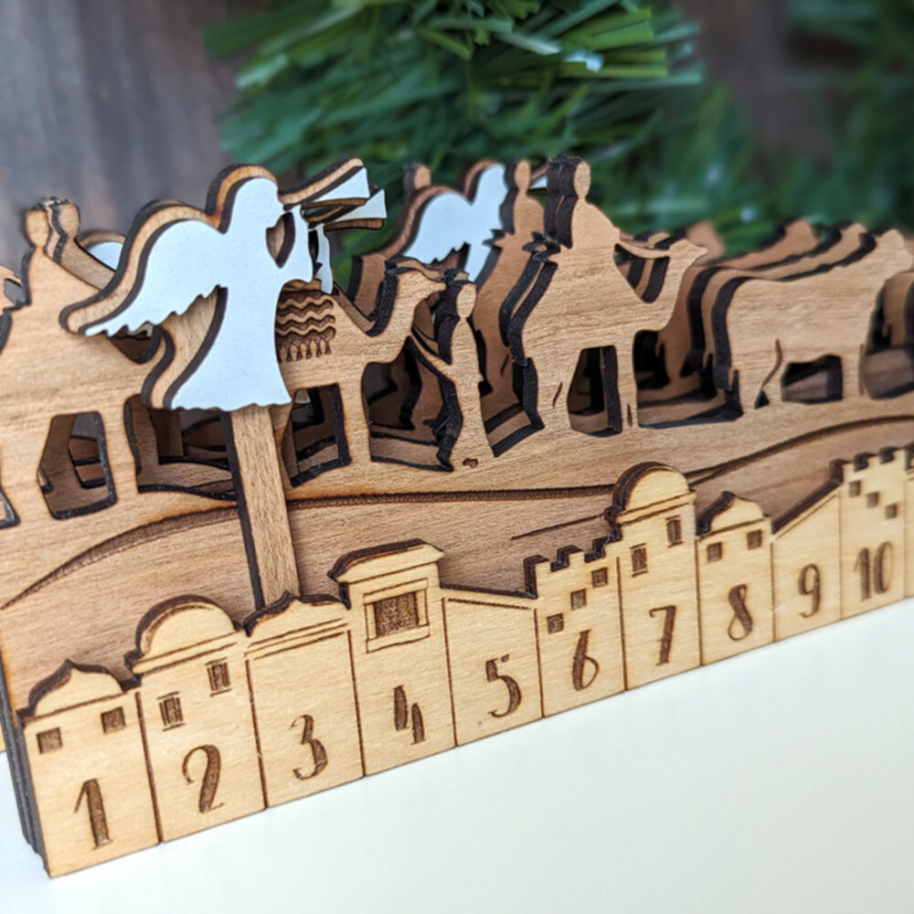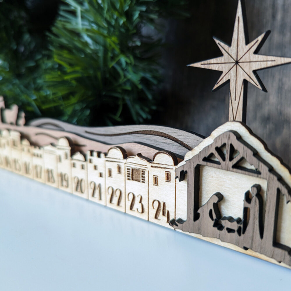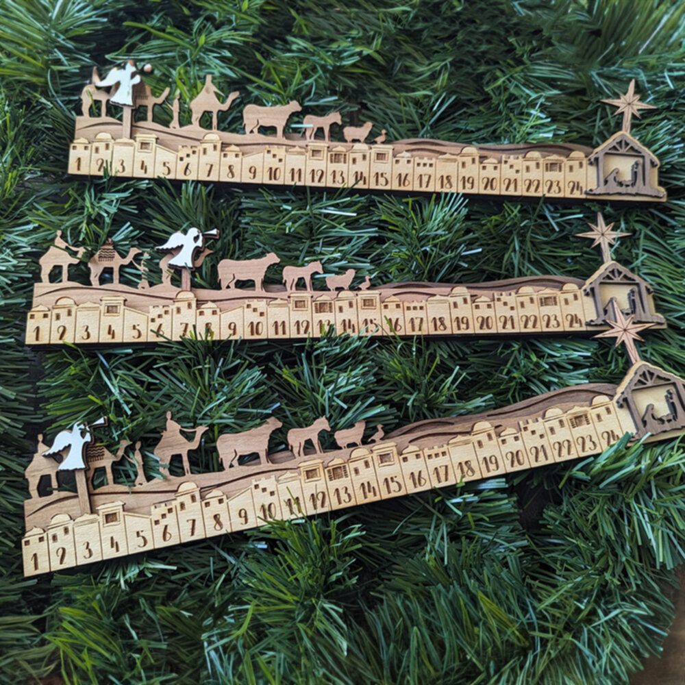 Embrace the spirit of Christmas with our handcrafted Nativity Advent Calendar. Constructed from layers of birch, cherry, and walnut and finished with a protective lacquer, this 15″ calendar is a masterpiece of design and craftsmanship. With movable pieces, including an angel and a star that slide into slots for each day, it offers a unique way to count down to Christmas. Ideal for families, this calendar not only decorates your home but also serves as a yearly reminder of the true reason for the season, making it a cherished addition to your holiday traditions.