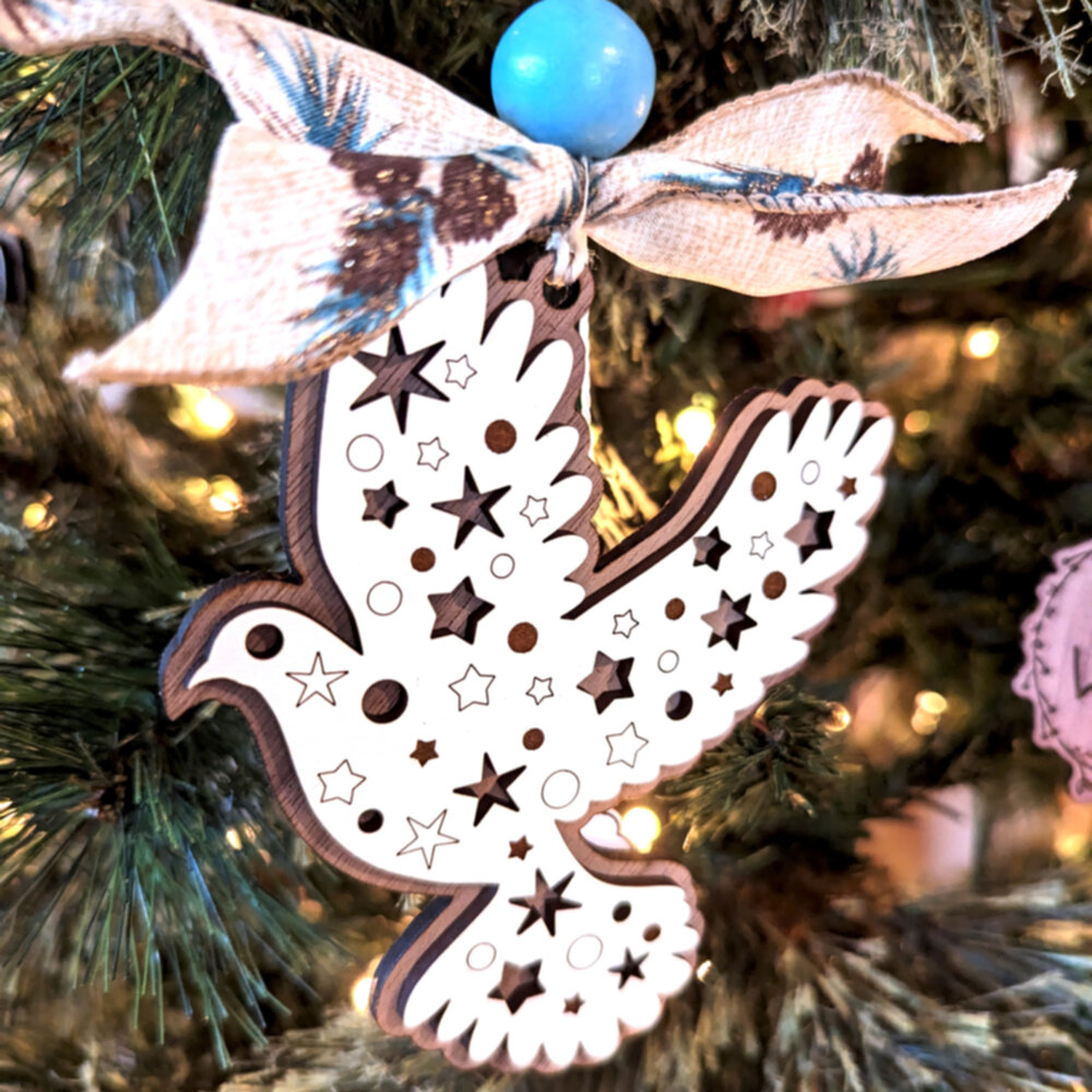Experience tranquility with our two-layered Dove Ornament, combining ethereal white with rich walnut, symbolizing peace and natural elegance.